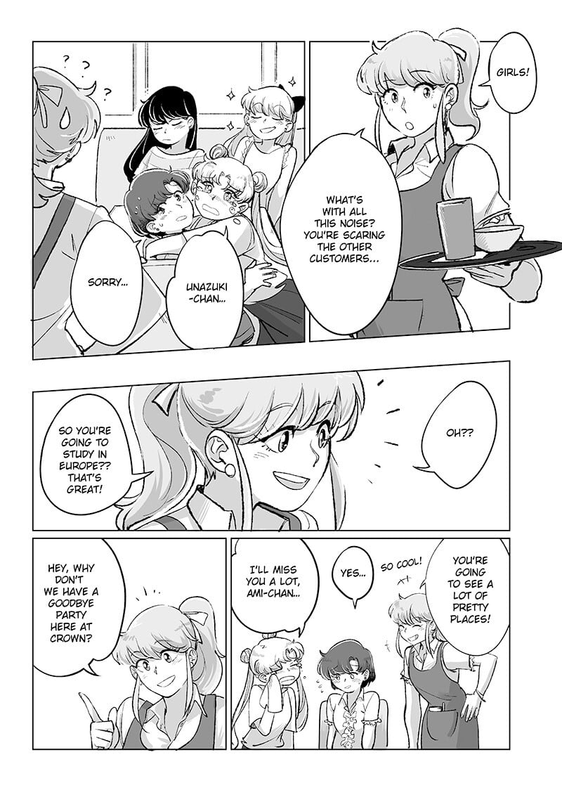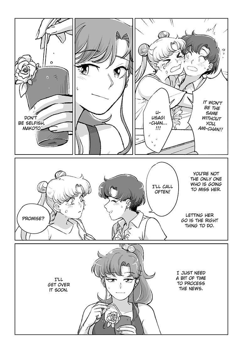 A Makoami doujinshi, set several years after the ending of the original 90s anime. The sailor senshi grow up and continue with their life, and Ami has to face a difficult decision: follow her dreams and go to study in Germany, or stay in Tokyo with the people she loves? Makoto, on the other hand, is not happy that she might leave.